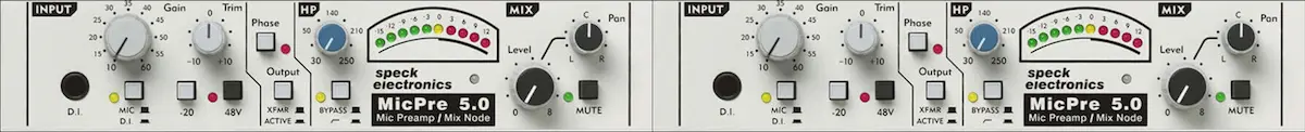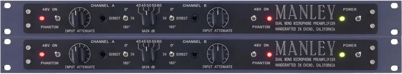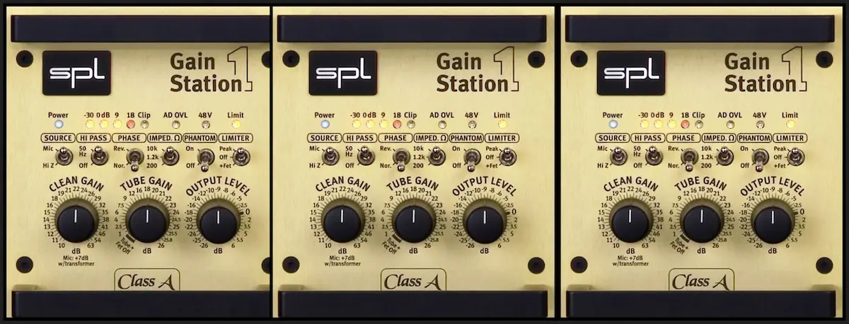 3 préamplis hybrides transistor + lampe avec compresseur-limiteur, adaptateur d’impédance pour micros dynamiques et ruban, 85 dB de gain. L’un de ces préamplificateurs inclut un transformateur d’entrée Jensen pour ajouter une légère (et plaisante) distortion harmonique
